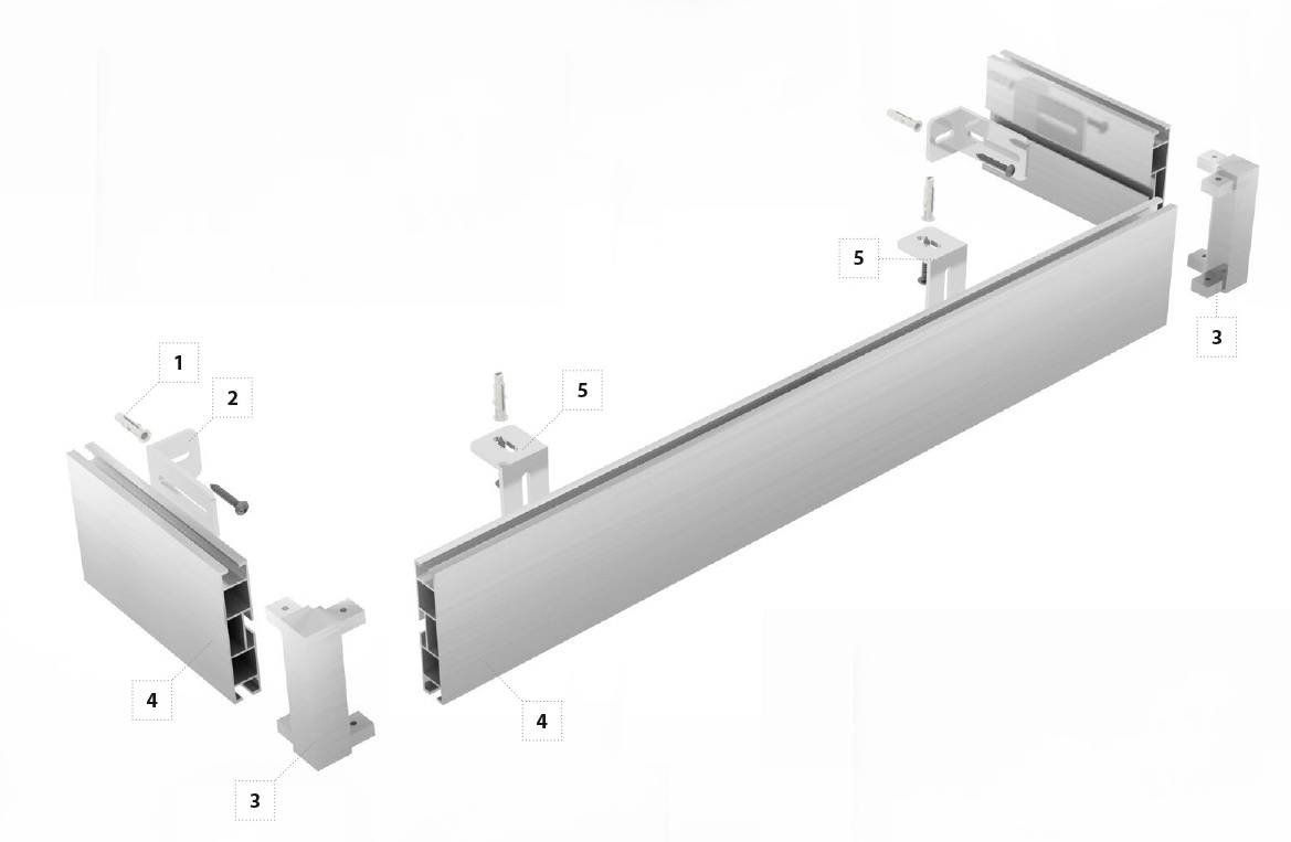 System TOP-LINE można zamontować do ściany, jak również bezpośrednio do sufitu za pomocą kątowników montażowych ( 2, 5) . Służą one także jako podparcie profila bocznego w wersji zamkniętej karnisza.