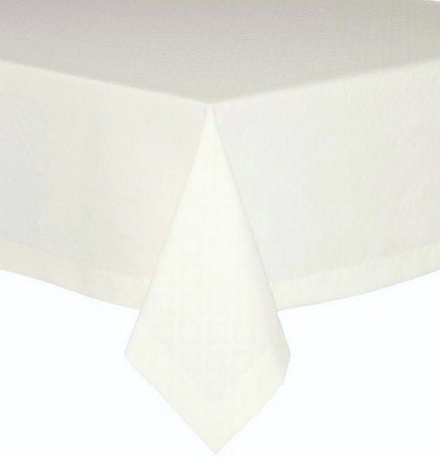 Obrus uszyty jest z plamoodpornej tkaniny z delikatnie tłoczonym wzorem, wykończony eleganckim założeniem 4 cm karo.