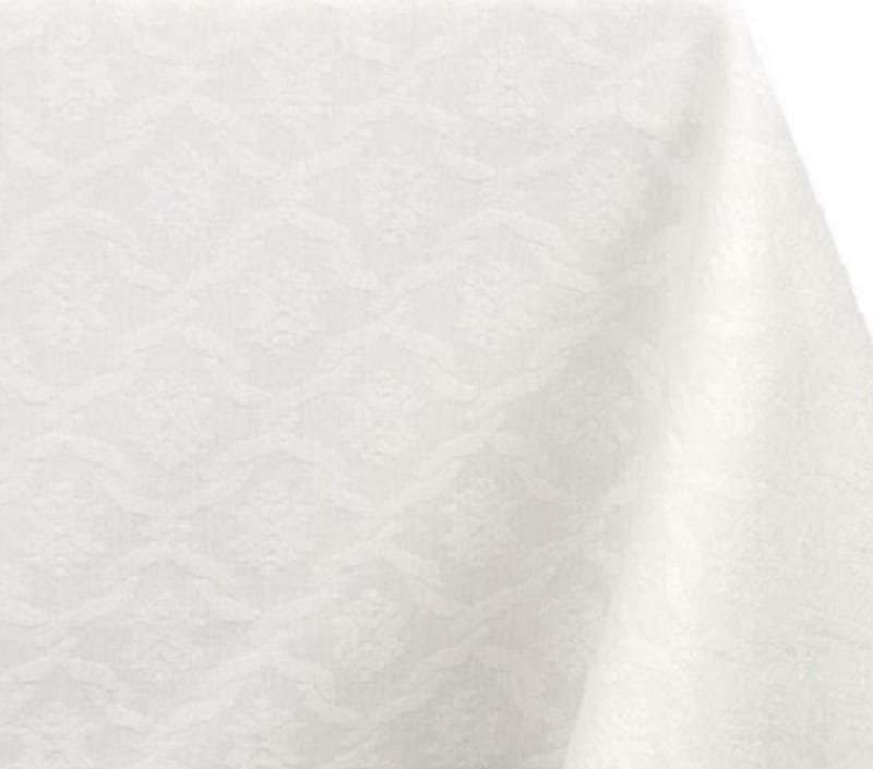 Plamoodporny obrus w kształcie koła uszyty z delikatnie tłoczonej tkaniny.